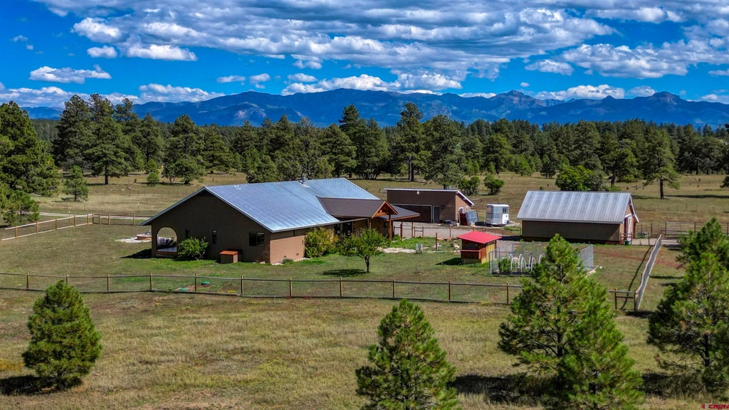 Absolutely picture perfect MOUNTAIN VIEWS surrounded by nature from this 2,000 sf ranch style home set at a quiet dead end road on 20 spectacular park-like acres. The land is all usable, fenced and cross-fenced with beautiful mature pines, lush pastures of brome and timothy for grazing and two ponds - one spring fed. Calling those looking for peaceful country living with NO HOA, this home has two bedrooms, plus a good sized office or flex room which could be used as a third bedroom, two full baths, living room with corner woodstove, vaulted ceilings with a ton of natural light and amazing views of Pagosa Peak, Eagle and Saddle mountains. The kitchen has a Bosch induction cook top, double oven, lots of cabinet space and is open to the dining room. The oversized two-car attached garage has wall to wall cabinets for storage and leads to the laundry/mud room. Radiant heat with 8 zones allows for clean efficient heating. Enjoy expansive views out front from the covered porch with Trex decking or soak up the sun from the south facing patio. From the entire east side of the property enjoy views of Square Top, Nipple Mountain, and Blackhead Peak. Bring your horses, dogs and toys as this property is all set up to start living your mountain dream. Dogs have over 1/2 acre fenced around the house. Nicely landscaped grounds provide vibrant colors throughout the season with lilacs, peonies, russian sage, lavender, roses, and a flowering crabapple tree. A garden with raised beds, a chicken coop with heat lamp, and a 55ft RV site w/ hookups are out back waiting to be enjoyed. In addition to the oversized attached garage, the detached two-car garage is a great shop and will house your mountain toys. The 900sqft barn has two 12x15 stalls with outlets for heated water buckets, hay storage for 180 bales, a frost free hydrant, outlets for heated troughs, excellent footing with sand, pea gravel, and stall mats throughout, and a lean-to/overhang leading to a 7200sqft paddock with Priefert utility panels and pea gravel footing. This is an ideal setup to care for your horses while allowing them plenty of room to roam. Located about 10 minutes from town, this rare and hard to find property will delight those looking for a very special country mountain home.